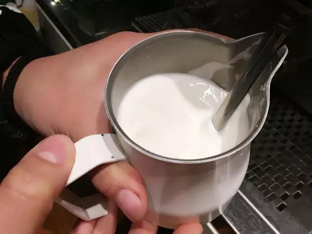 ①將牛奶倒入拉花杯,至少半滿。一定記住別二次加熱牛奶,所以需要多少就加多少。