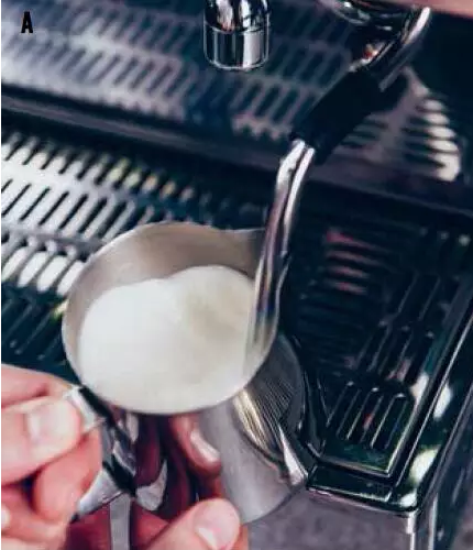 ④開始打泡,沿拉花杯的內周控制蒸汽流的方向,把奶打成漩渦狀(圖A)。