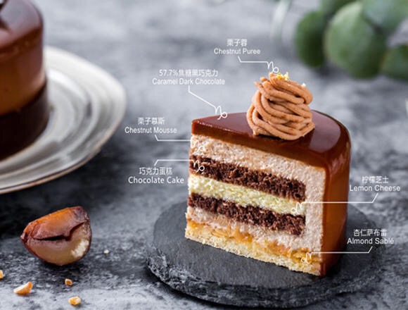 香甜的栗子慕斯與可可濃烈的香氣碰撞,檸檬飄香浸潤舌尖。一切細滑松軟直達底部,“咔嚓”一聲的酥脆口感來自鋪滿杏仁的薩布雷,飽滿香脆的堅果給予了最樸實的味蕾熨帖。