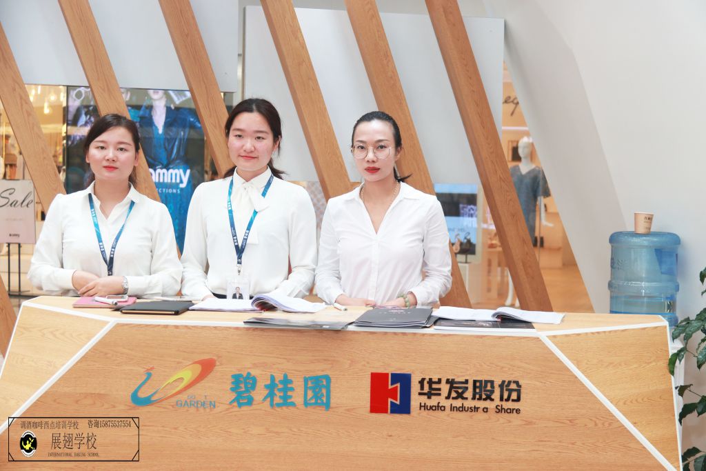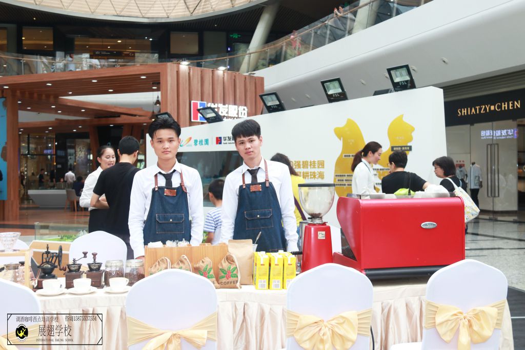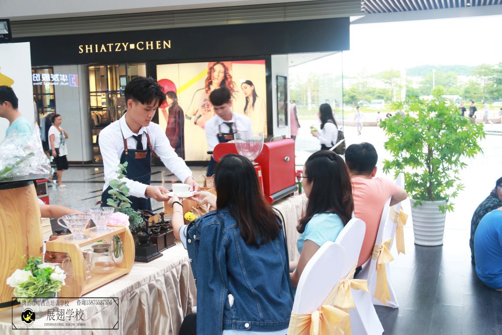 2018年8月11日,佛山展翅咖啡調酒西點培訓學校的咖啡師學員受邀在碧桂園濱海天際展覽廳為現場觀看與咨詢樓盤的嘉賓提供咖啡飲品。