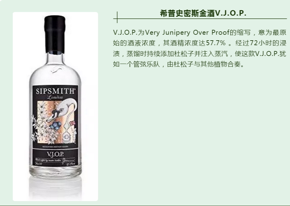 希普史密斯金酒V.J.O.P. V.J.O.P.為Very Junipery Over Proof的縮寫,意為最原始的酒液濃度,其酒精濃度達57.7% 。經過72小時的浸漬,蒸餾時持續添加杜松子并注入蒸汽,使這款V.J.O.P.猶如一個管弦樂隊,由杜松子與其他植物合奏。