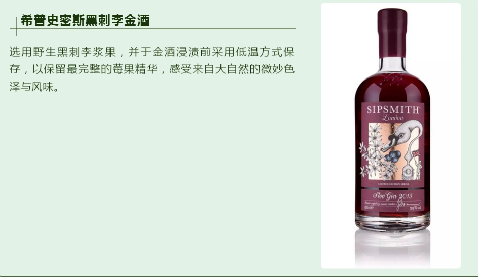 希普史密斯黑刺李金酒 選用野生黑刺李漿果,并于金酒浸漬前采用低溫方式保存,以保留最完整的莓果精華,感受來自大自然的微妙色澤與風味。